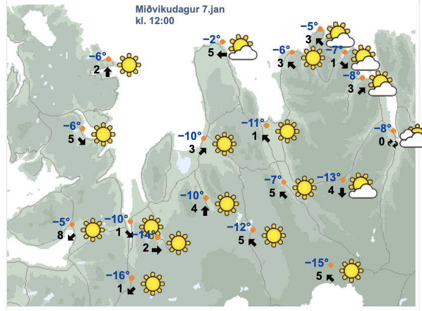 Frostið er um -12°C á Sauðárkróksflugvelli nú um klukkan níu en á Hrauni á Skaga og við Stafá í Sléttuhlíð er frostið á sama tíma áætlað -3°C. Í Húnavatnssýslum er frostið um -8°C. Það dregur úr kuldanum þegar líður á daginn og nálgast frostmark um miðnætti. Áfram verður þó kalt næstu daga og kuldaboli gefur engin grið um helgina en þá er spáð yfir tíu stiga frosti víðast hvar – nema reyndar á Hrauni á Skaga sem virðist ætla að verða í öðru veðurkerfi en aðrir staðir á Norðurlandi vestra og hitamælirinn dirfist varla að fara neitt að ráði niður fyrir frostmarkið.