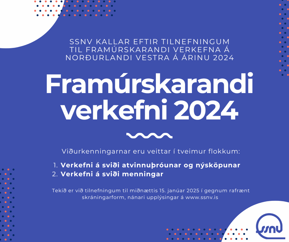 SSNV kallaði fyrr í þessum mánuði eftir tilnefningum til framúrskarandi verkefna á Norðurlandi vestra fyrir árið 2024 og er þetta í sjötta sinn sem þessi viðurkenning verður veitt. Veittar eru viðurkenningar í tveimur flokkum; verkefni á sviði atvinnuþróunar og nýsköpunar og verkefni á sviði menningar. Viðurkenningarnar geta fallið í hlut einstaklinga, hópa, félaga, fyrirtækja eða stofnana á Norðurlandi vestra fyrir framlag sitt í ofangreindum flokkum og er tekið við tilnefningum til miðnættis 15. janúar 2025 í gegnum rafrænt skráningarform. Ekki er tekið við tilnefningum með öðrum hætti.