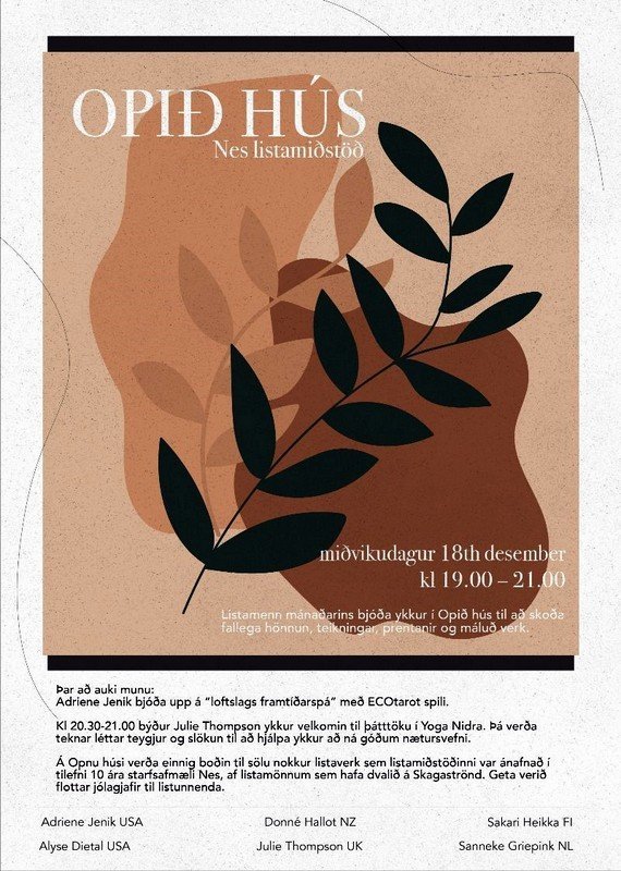 Í dag, miðvikudaginn 18. desember, klukkan 19-21 munu listamenn desembermánaðar hjá Nesi listamiðstöð á Skagaströnd bjóða til opins húss. Þar verður gestum boðið upp á að skoða fallega hönnun, teikningar, prentanir og máluð verk. Einnig ætlar Adriene Jenik að bjóða upp á „loftslags framtíðarspá“ með ECOtarot spili. Klukkan 20:30-21:00 býður Julie Thomson gesti velkomna til þátttöku í Yoga Nidra. Þá verða teknar léttar teygjur og slökun til að hjálpa gestum að ná góðum nætursvefni.
