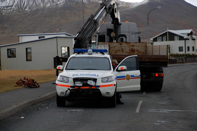 Skemmdir á lögreglubílnum voru ekki miklar en nægar til að hann var óökufær, líklega er vatnskassinn ónýtur.