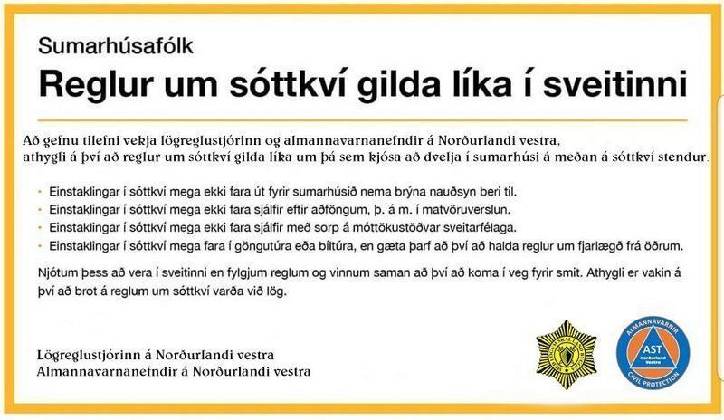Að gefnu tilefni vekja lögreglustjóri og almannavarnanefndir a Norðurlandi vestra athygli á því að reglur um sóttkví gilda líka um þá sem kjósa að dvelja í sumarhúsi meðan á sóttkví stendur.
