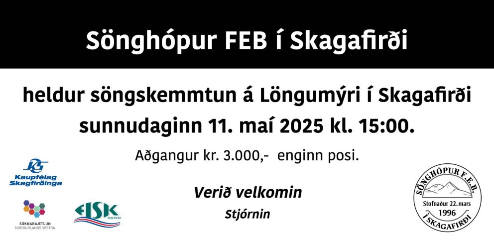 Sönghópur félags eldri borgara í Skagafirði heldur söngskemmtun á Löngumýri í Skagafirði sunnudaginn 11. maí 2025 kl. 15:00.