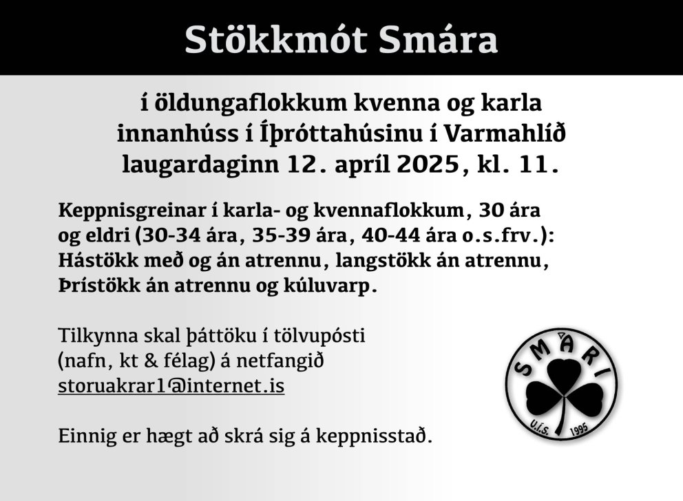 Þau leiðu mistök urðu við uppsetningu á Sjónhorni vikunnar að vitlaus dagsetning var í auglýsingu frá Ungmenna- og Íþróttafélaginu Smára. Hér kemur rétta auglýsingin en þau ætla að halda Stökkmót Smára í öldungaflokkum kvenna og karla innanhúss í Íþróttahúsinu í Varmahlíð laugardaginn 12. apríl 2025, kl. 11.