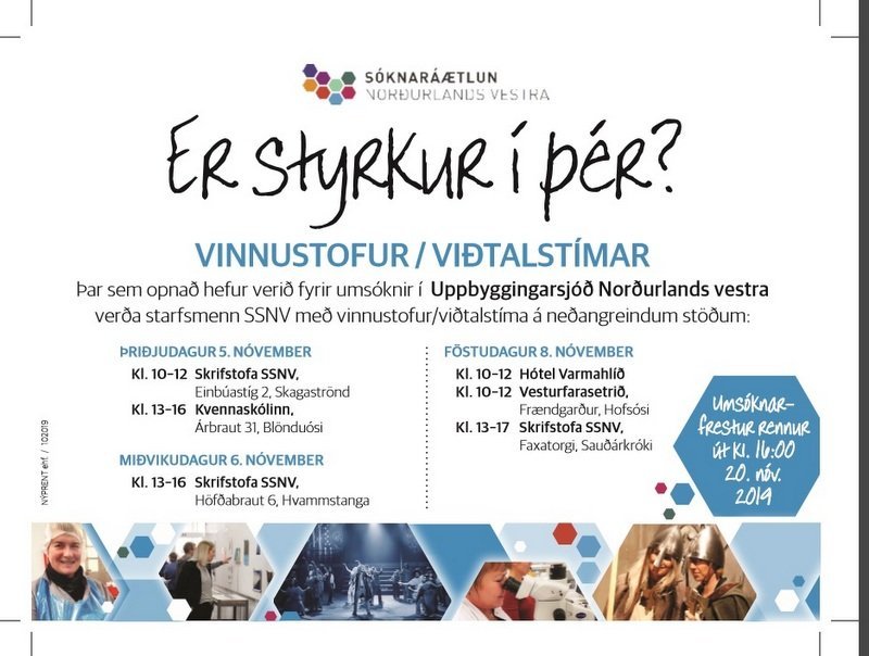 Opnað hefur verið fyrir umsóknir í Uppbyggingarsjóðs Norðurlands vestra fyrir árið 2020 og verða starfsmenn SSNV með vinnustofur/viðtalstíma á neðangreindum stöðum þar sem boðið verður upp á einstaklingsaðstoð við gerð umsókna, veittar upplýsingar um styrkmöguleika, auk almennrar aðstoðar í tengslum við atvinnu- og menningarstarfsemi.
