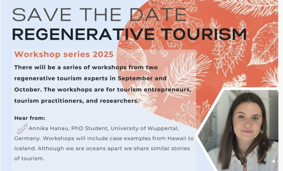 Í september eru tvær vinnustofur í boði um endurnýjandi ferðaþjónustu þar sem Annika Hanau, doktorsnemi við Háskólann í Wuppertal í Þýskalandi, leiðir fræðslu og umræðu. Hún mun deila reynslu og dæmum allt frá Hawaii til Íslands og skoða hvernig svipuð viðfangsefni koma upp þrátt fyrir fjarlægðir, þetta kemur fram á vef SSNV.