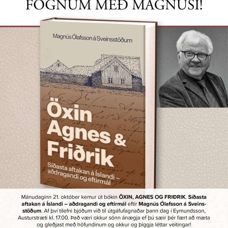 Feykir sagði frá því um helgina að í tilefni útkomu bókarinnar Öxin, Agnes og Friðrik eftir Magnús Ólafsson á Sveinsstöðum yrði haldin útgáfuhátíð í Reykjavík í gær. Það er skemmst frá því að segja að það var fullt út úr dyrum í Penninn Eymundsson í Austurstræti.
