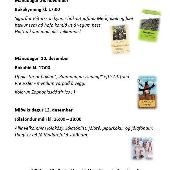 Jólabasar kvenfélagsins Heklu verður haldinn í Skagabúð sunnudaginn 2. desember kl. 14-17. Þar verður ýmislegt til sölu, s.s. jólakort og pappír, gott úrval af heimaunninni vöru og handverki. Heitt súkkulaði og meðlæti selt á 1.000 kr. fyrir eldri en 12 ára, 500 kr. fyrir 7-12 ára og frítt fyrir 6 ára og yngri.