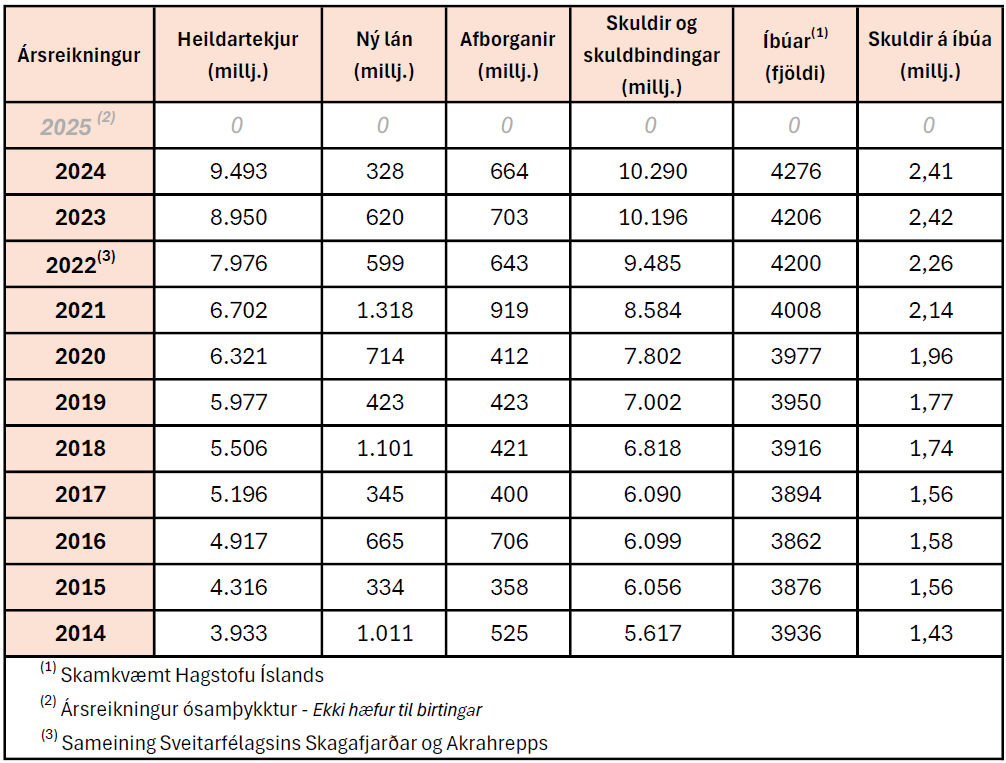 Á tíu ára tímabili milli áranna 2015 og 2024 er tekjuaukning upp á 5.177 milljónir. Þrátt fyrir það hafa heildarskuldir aukist um 4.235 milljónir og lántaka að meðaltali verið 645 milljónir á ári, yfir sama tímabil.