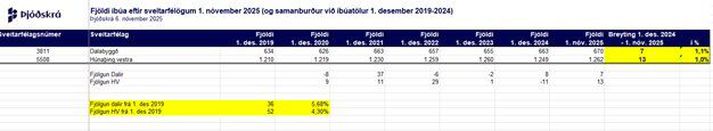Við einfalda skoðun kemur í ljós að Dalamönnum fjölgar hlutfallslega meira en íbúum í Húnaþingi vestra frá 1. des 2019 miðað við tölur frá Þjóðskrá birtar á vef þeirra í nóvember 2025. Þannig þurfum við ekki deila lengi um þá staðreynd máls.