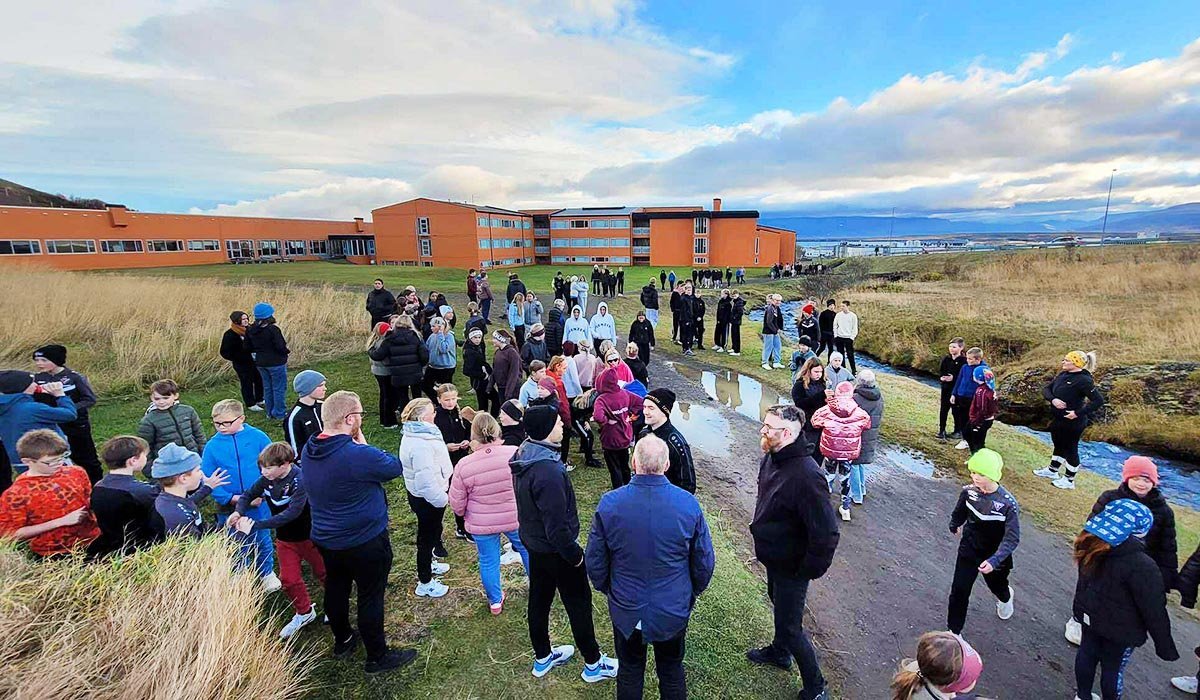 Nemendur og starfsfólk Árskóla í Sauðárgili. Á myndinni að neðan má sjá nemendur að hlaupi lokni á gervigrasvellinum neðan Grænuklaufar. MYNDIR: LÁRA HALLA