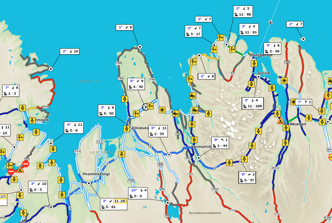 Allir vegir á Norðurlandi vestra voru færir nú í morgun en víða er snjóþekja á vegum og éljagangur eða skafrenningur. Hálka er á Holtavörðuheiði, Sauðárkróksbraut og á Öxnadalsheiði en annars hálkublettir eða snjóþekja á vegum. Spáð er norðanátt og lítils háttar snjókomu á svæðinu í dag.