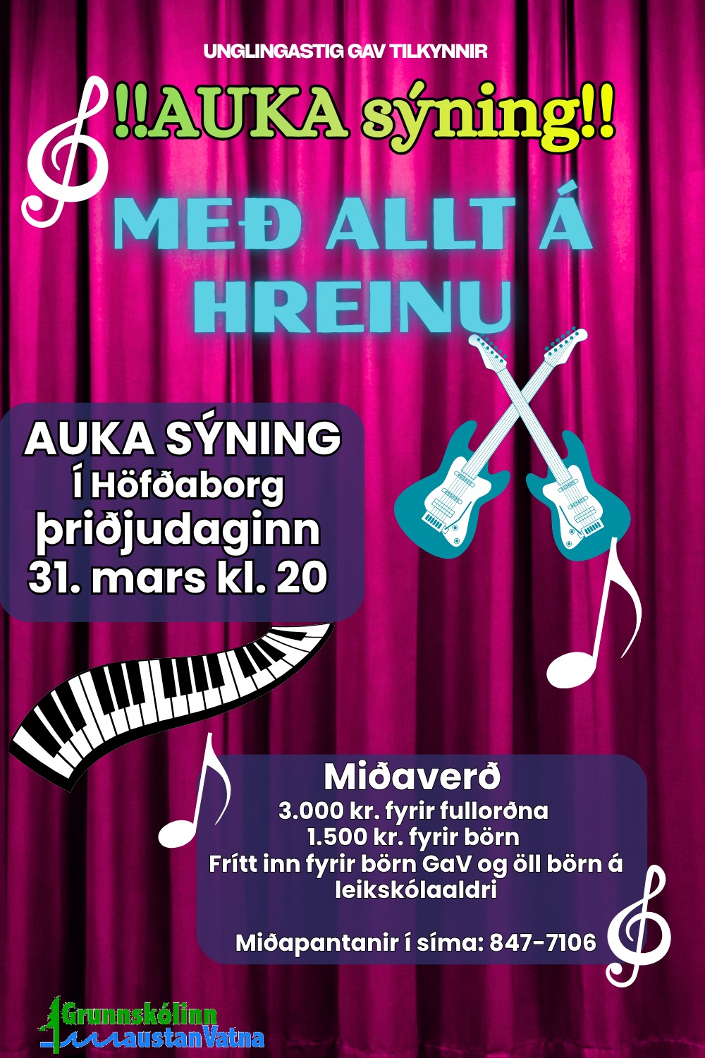 Veðrið hefur sett strik í ansi marka reikninga undanfarið og vegna veðurs þurftu nemendur í Grunnskóla austan Vatna að fresta sýningunni með Allt á Hreinu sem átti að vera í sl föstudagskvöld. Aukasýning verður á morgun þriðjudag 31. mars klukkan 20.