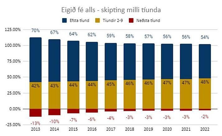 Hér eru gögn Hagstofunnar um eigið fé (eignir að frádregnum skuldum) sett upp sem eign hverrar tíundar (10% af heildinni) sem hlutfall af heildarauði í landinu. Líkt og sjá má áttu ríkustu 10% landsmanna 70% af eignum landsins árið 2013 en í fyrra var hlutfallið orðið 54%. Þeir sem minnst eiga eru mjög nálægt því að komast í jákvætt eigið fé, þ.e.a.s. að hún eigi meira en hún skuldar. Þetta er stórmerkilegt því í þessari tíund er yfirleitt stór hluti námsmanna sem safnar skuldum áður en haldið er út í lífið og hefur ekki hafið eignasöfnun. Það er annað sem þarf að hafa í huga hér að á milli ára getur fólk færst á milli tíunda og margir sem byrja fullorðinsárin í neðstu tíundunum en vinna sig svo upp. Fullyrðing Þórhildar Sunnu er sem betur fer bara í leikritinu hennar, því hér er ekki vaxandi misskipting auðs heldur þvert á móti – eignajöfnuður er að aukast á Íslandi.