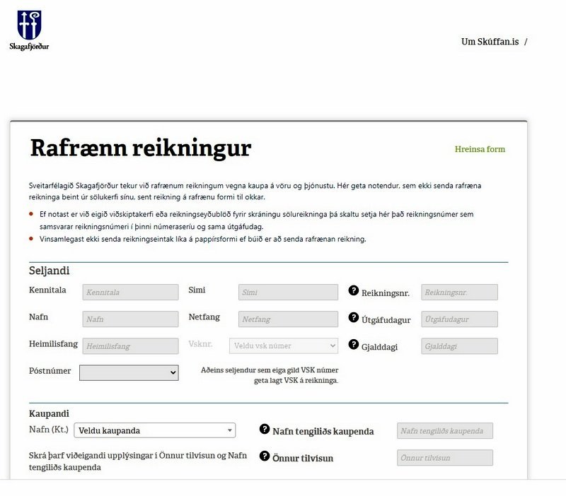 Á síðu sveitarfélagsins segir að í gáttinni geti seljendur á vörum og þjónustu, sem ekki senda rafræna reikninga beint úr sölukerfi sínu, sent reikning á rafrænu formi til sveitarfélagsins en gáttina má finna í hægri dálki á forsíðu skagafjordur.is. Ekki er þörf á að senda pappírsreikning til sveitarfélagsins þegar búið er að senda reikninginn inn rafrænt í gegnum gáttina.