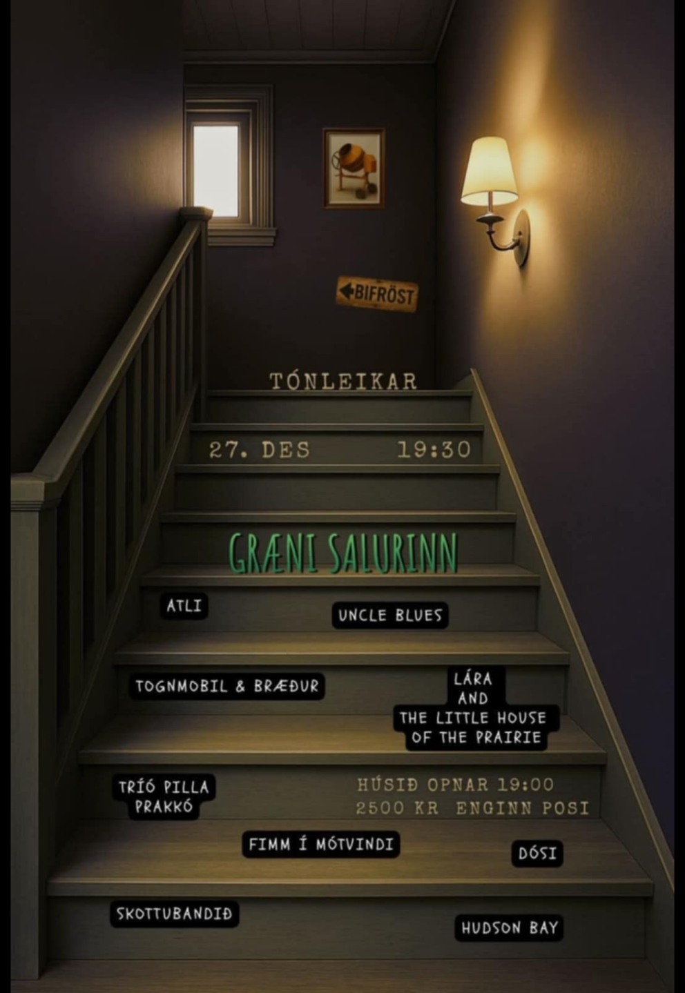 Tónleikarnir Græni Salurinn fara fram laugardagskvöldið 27.desember og hefjast kl 19:30 en húsið verður opnað gestum kl 19:00. Níu hljómsveitir stíga á stokk, skagfieskt tónlistarfólk sem stefnir á að skemmta sér og gestum i Bifröst - og skapa Græna Sals fíling - eins og Sigurlaug Vordís sagði þegar Feykir spurðst fyrir um sjóið.