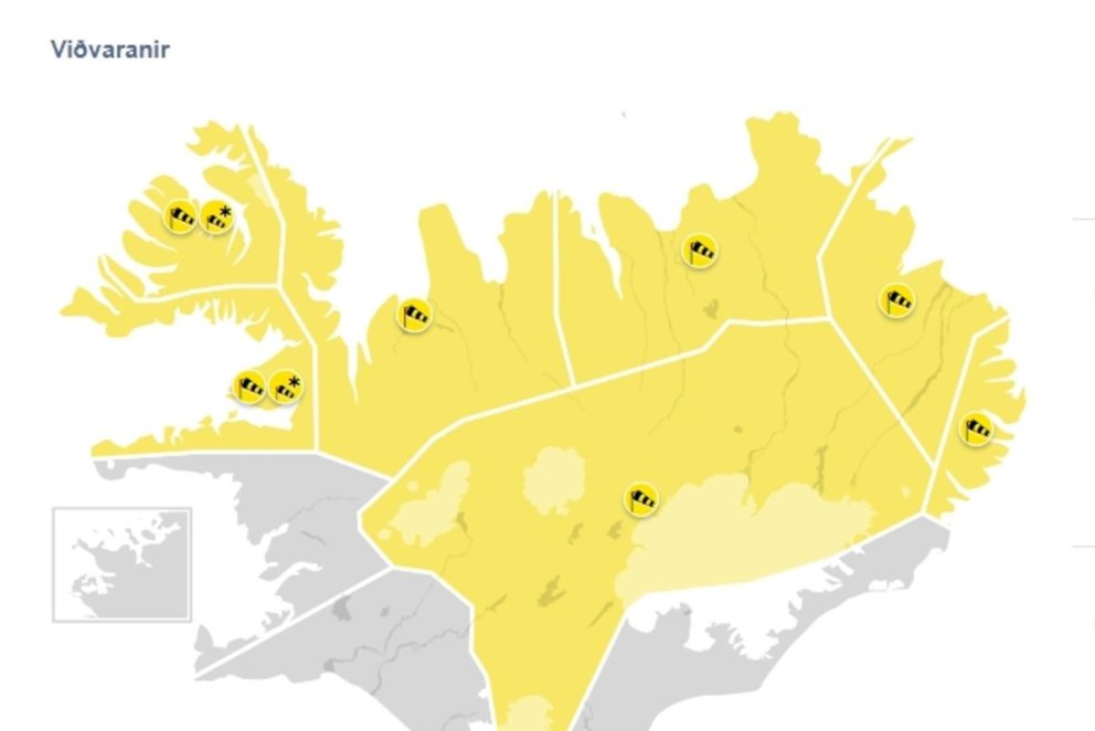 Viðvörunin tekur fyrst gildi við Breiðafjörð klukkan 23 og nær hún svo til Strandasvæðisins og Norðurlands vestra klukkan 3 í nótt.