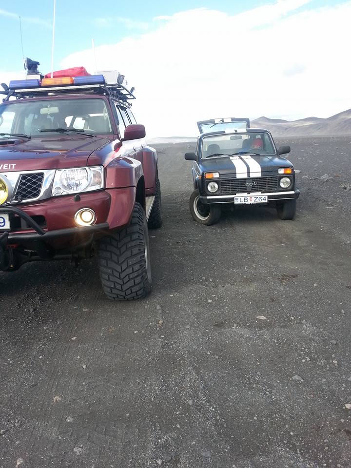 Með í för Húna eru félagar úr Björgunarsveitinni Strönd á Skagaströnd og tveir menn frá systursamtökum Landsbjargar í Wales. Hópurinn var varla mættur á Hálendisvaktina í gær er fyrsta aðstoðarbeiðni barst. Um var að ræða bilaðan rússneskan eðalvagn. Framhjólin voru ekki samstíga hvert skildi stefna eins og fram kemur á fésbókarsíðu Húna og sjá má á meðfylgjandi mynd sem þaðan er fengin.