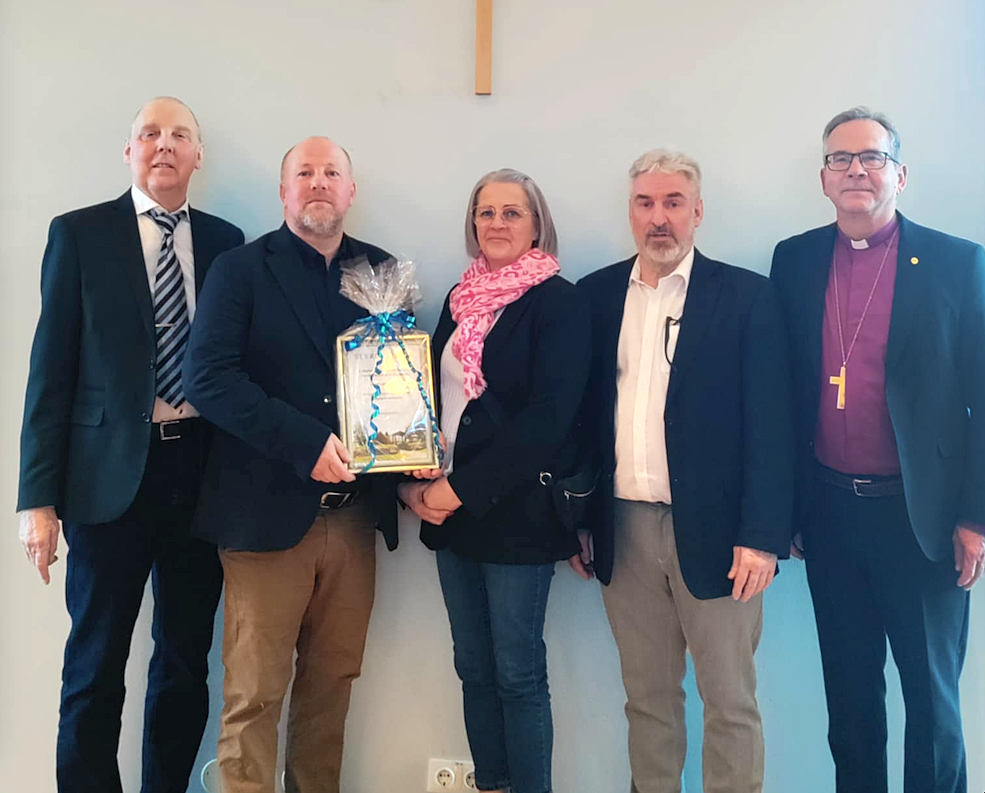 Sóknarnefnd Víðimýrarkirkju afhendir veglegan styrk til Löngumýrar. Frá vinstri: Böðvar Finnbogason gjaldkeri, Gunnar Rögnvaldsson staðarhaldari, Sólrún Ásgeirsdóttir ritari, Kolbeinn Konráðsson formaður sóknarnefndar Víðimýrarkirkju og sr. Gísli Gunnarsson vígslubiskup.  MYNDIR: GUNNI RÖGG