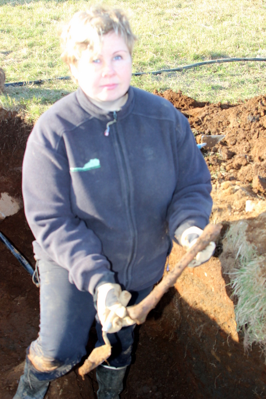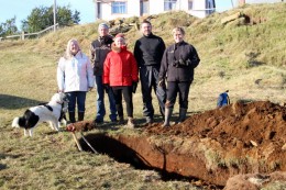Við skurðinn þar sem kirkjugarðurinn fannst við gamla bæinn í Keflavík. F.v. Þórey Jónsdóttir bóndi, Guðmundur St. Sigurðarson og Bryndís Zoëga sérfræðingar hjá Byggðasafni Skagfirðinga, Þór Hjaltalín minjavörður Norðurlands vestra og Guðný Zoëga deildarstjóri Fornleifadeildar Byggðasafns Skagfirðinga.