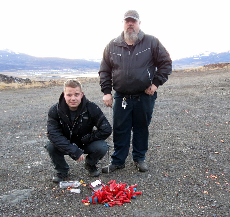 Formaðurinn Jón Pálmason tínir upp tóm skothylki sem einhverjir hafa skilið eftir sig. Mynd: Ósmann