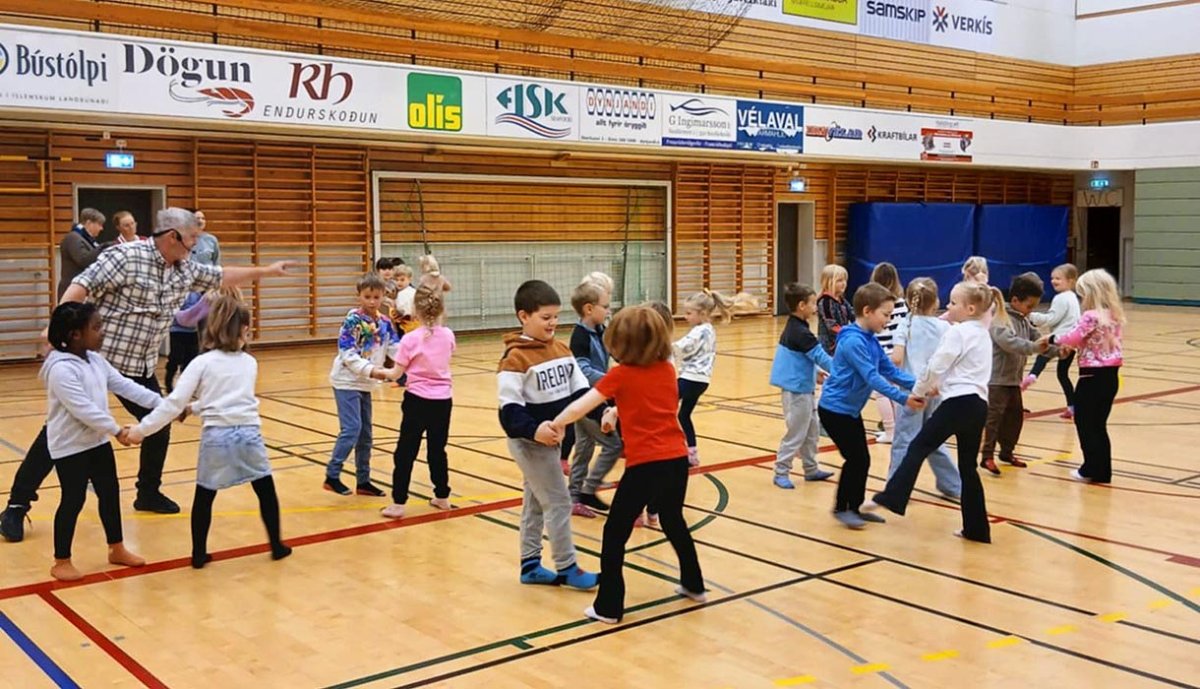 Það er sem betur fer ekki bara lestur, reikningur og skrift sem börnin í Árskóla á Sauðárkróki þurfa að vera með á hreinu. Í gær mætti Logi Vígþórs enn eitt árið í skólann til að hrista feimnina úr börnunum og kenna þeim að dansa.