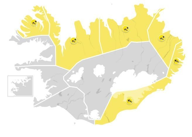 Um miðnættið fellur gula viðvörunin úr gildi á Norðurlandi vestra og svo hver af annarri eftir því sem austar dregur fram á morguninn.