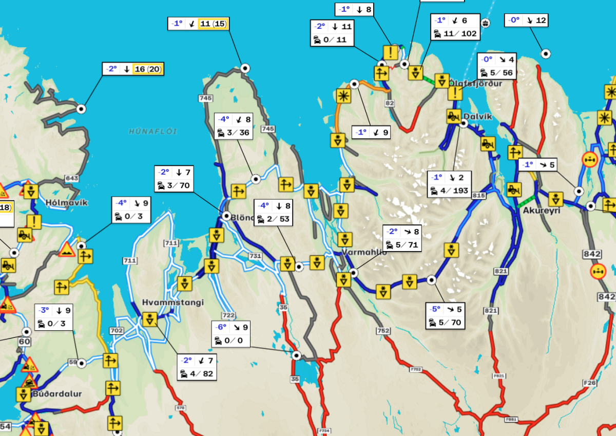Hálka er á þjóðvegi 1 í Langadal og vestan Blönduóss og sömuleiðis á Öxnadalsheiði og Holtavörðuheiði en á öðrum vegum er yfirleitt snjóþekja en þungfæri er í Sléttuhlíðinni í Skagafirði og inn í Fljót. Skafrenningur er á Þverárfjallsvegi en má segja að á öðrum vegum á svæðinu sé éljagangur og því vissara að aka með gát.