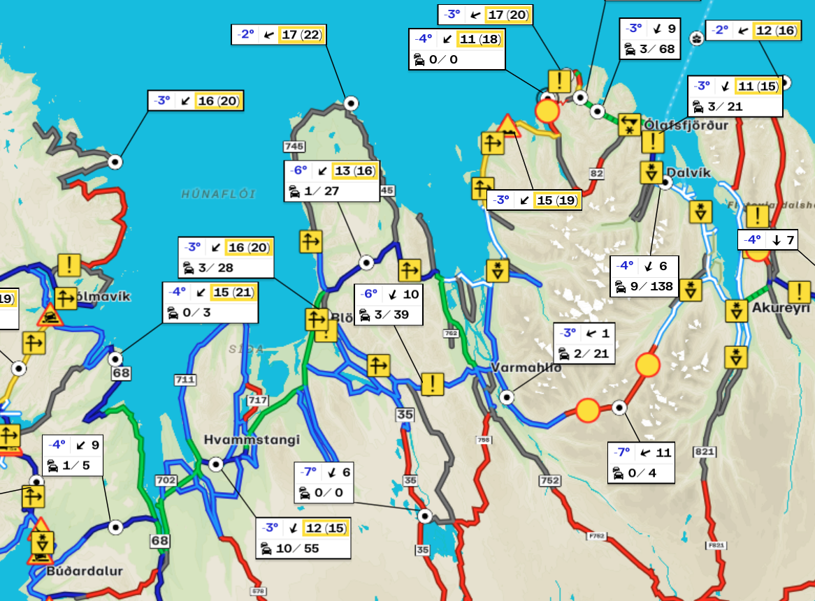 Samkvæmt upplýsingum á umferðarsíðu Vegagerðarinnar er Öxnadalsheiðin ófær sem stendur vegna óveðurs en víðast hvar í nágrenni eða við Tröllaskagann gengur á með éljum og snjóþekja er á vegum í nágrenni Akureyrar. Sama gildir um veginn frá Sauðárkróki. til Hofsóss. Þjóðvegur 1 er ýmist greiðfær eða með hálkublettum.