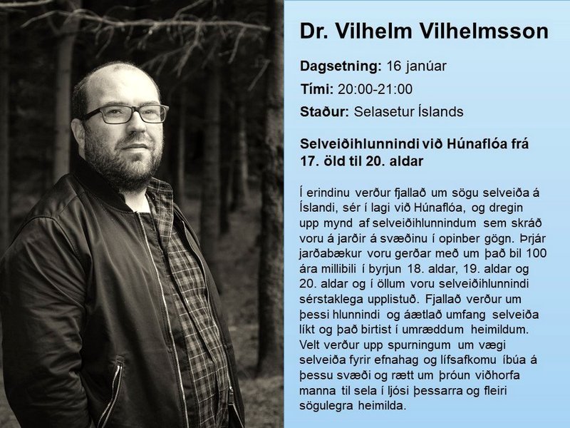 Í erindinu fjallar Vilhelm um sögu selveiða á Íslandi, sér í lagi við Húnaflóa, og dregur upp mynd af selveiðihlunnindum sem skráð voru á jarðir á svæðinu í opinber gögn. Þrjár jarðabækur voru gerðar með um það bil 100 ára millibili í byrjun 18. aldar, 19. aldar og 20. aldar og í öllum voru selveiðihlunnindi sérstaklega upplistuð. Fjallað verður um þessi hlunnindi og áætlað umfang selveiða líkt og það birtist í umræddum heimildum. Velt verður upp spurningum um vægi selveiða fyrir efnahag og lífsafkomu íbúa á þessu svæði og rætt um þróun viðhorfa manna til sela í ljósi þessarra og fleiri sögulegra heimilda.