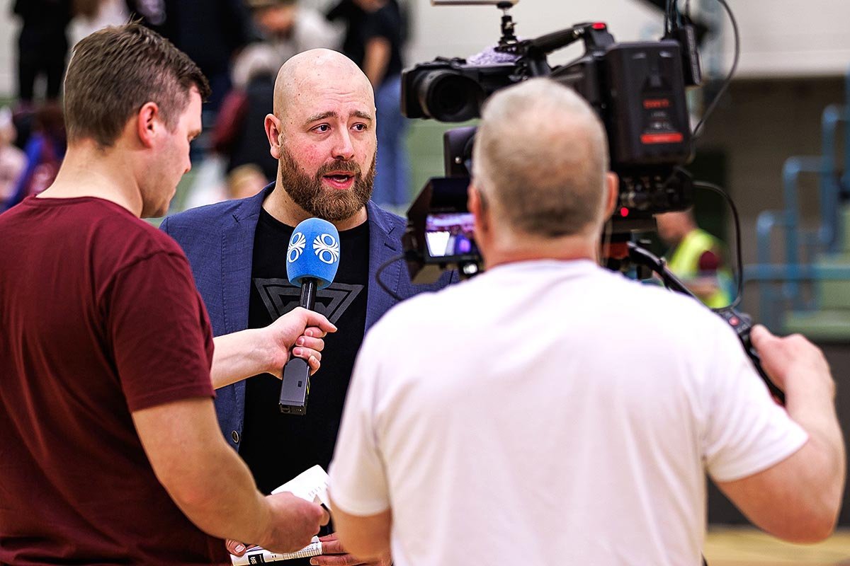 Arnar þjálfari í spjalli við RÚV að leik loknum í gær. MYND: DAVÍÐ MÁR