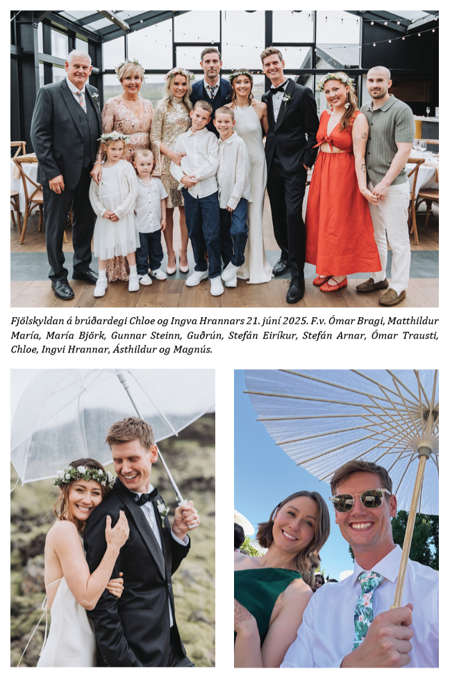 Það var gifting í sumar, hvað get-urðu sagt okkur um það? „Já, við Chloe giftum okkur á Íslandi í sumar og það var mikil veisla. Við veltum fyrir okkur lengi hvort við ættum að gifta okkur hér úti eða heima á Íslandi en ákváðum að gera það á Íslandi til þess að leyfa hennar fjölskyldu og vinum að sjá Ísland. Svo erum við úti þannig að okkar fjölskylda og vinir hafa tækifæri að koma hingað og heimsækja okkur. Við héldum opn-unarpartý í Iðnó á fimmtudeginum, svo var haldið í Sky Lagoon á föstudegi með hópinn. Athöfnin og veislan voru síðan á laugardeginum í Bíó Paradís og iON Adventure hótelinu. Eftir giftinguna héldum við norður með erlendu gestina og sýndum þeim Skagafjörð og Eyjafjörð með tilheyr-andi Drangeyjarferðum, hvalaskoðun og Skógarböðum. Þetta var stórkostlegur tími.“