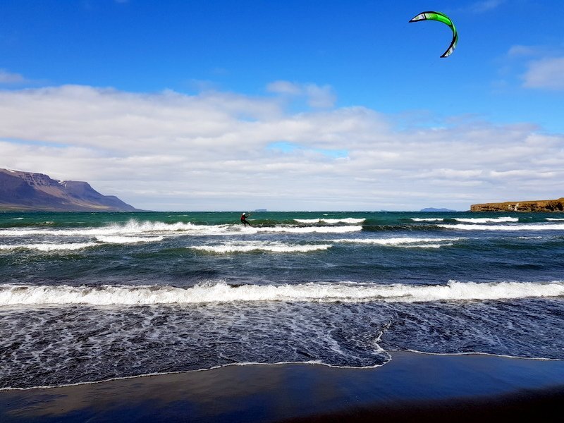 Þeir vöktu sannkallaða athygli brettakapparnir sem þeystu eftir sjávaröldunum við Borgarsand um helgina, hangandi í vinddrekum. Kite surfing er þetta kallað upp á enskuna en gott íslenskt heiti vantar yfir þessa íþrótt. Kite grúbban, er hópur áhugasamra Kite surfara á Íslandi og héldu þeir árhátíð sína á Bjórhátíðinni á Hólum um helgina og tóku að sjálfsögðu allan búnað til brettaiðkunar með.