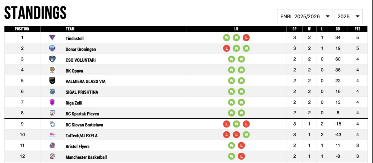 Staða tólf efstu liðanna í EBNL-deildinni en samkvæmt töflunni eru 26 lið í deildinni. Manchester um miðja deild með einn sigur og eitt tap. SKJÁSKOT AF SÍÐU ENBL
