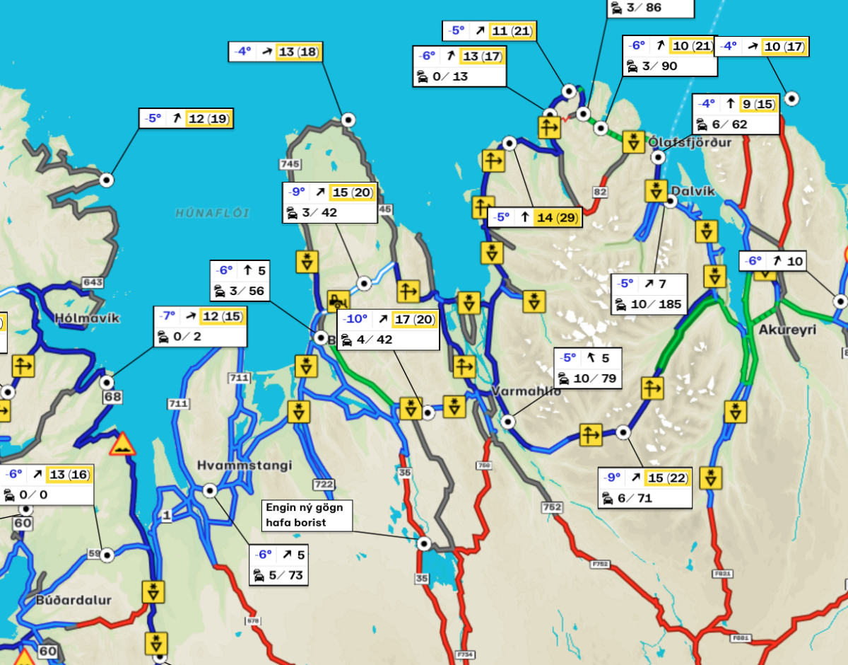 Sem fyrr segir er færð sem stendur ágæt á Norðurlandi. Langidalurinn er greiðfær og þá ber svo við að Öxnadalur er sömuleiðis greiðfær og sama gildir um Eyjafjarðarbraut inn af Akureyri, Víðast hvar annarsstaðar er hálka eða hálkublettir. Snjóþekja er nú á Þverárfjallsvegi og þar er unnið að mokstri. Það er snarpur vindur á Þverárfjallsvegi, Vatnsskarði og á Öxnadalsheiði eða um 16 m/sek. Nokkuð stillt er á Holtavörðuheiði en þar er búið að hálkuverja. Þar er nú éljagangur og spár gera ráð fyrir snjókomu og auknum vindi upp úr hádegi.