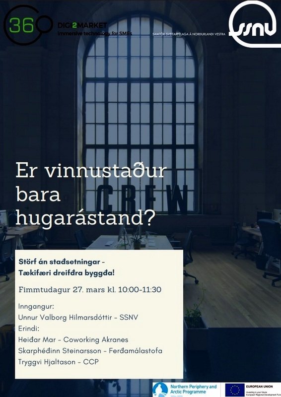 Samtök sveitarfélaga á Norðurlandi vestra, SSNV, stóðu fyrir vefráðstefnuninni Er vinnustaður bara hugarástand? í gær, fimmtudaginn 27. febrúar. Ráðstefnan var hluti af verkefninu Digi2Market sem styrkt er af Norðurslóðaáætlun og miðar að því að efla dreifðari byggðir með því að nýta stafrænar lausnir almennt.