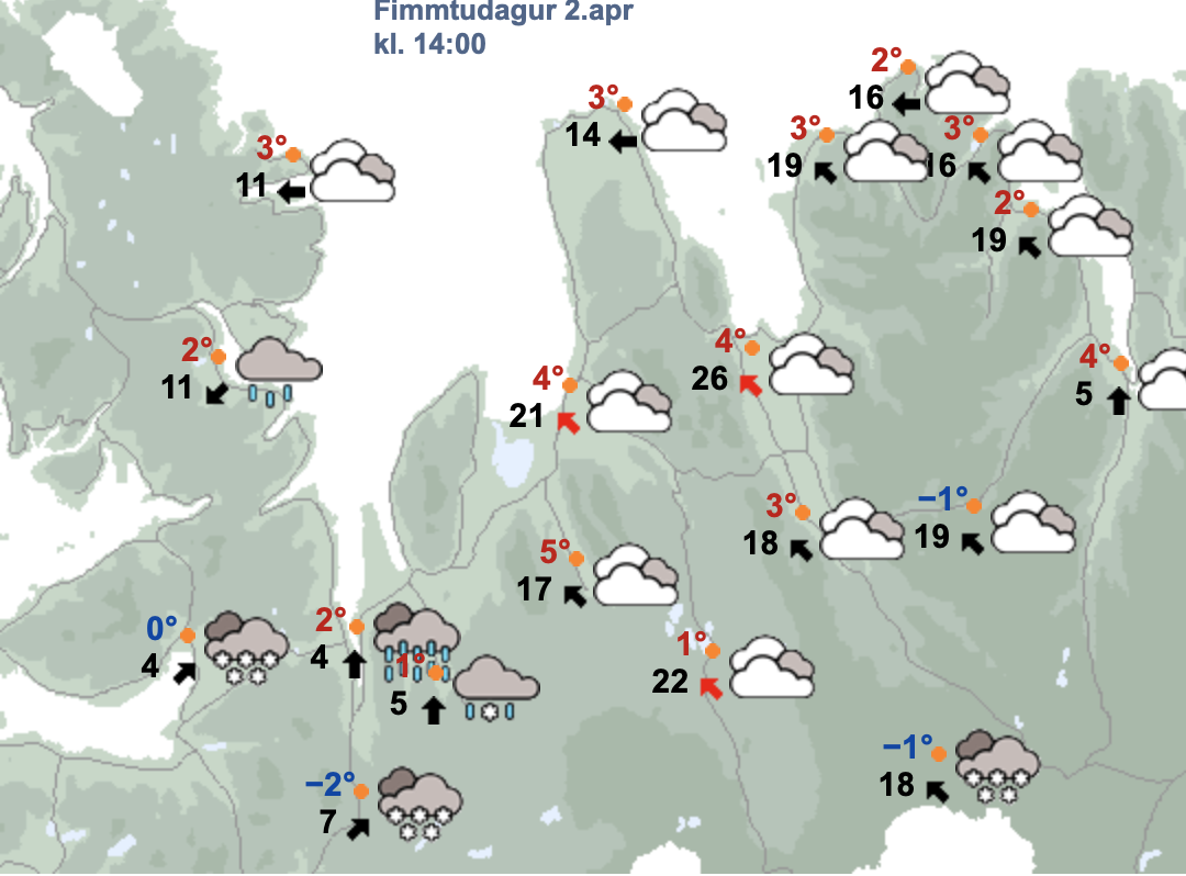 Veðurspáin fyrir kl. 14 á skírdag. SKJÁSKOT AF VEÐUR.iS