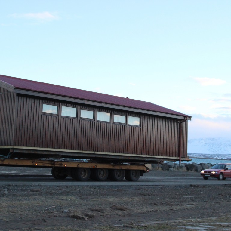 Á ferðum sínum í síðustu viku rakst blaðamaður á þennan bíl á ferðinni um Sauðárkrók og var hann að flytja heldur óvenjulegan varning, eða heilt hús. Um er að ræða eina af lausu kennslustofunum sem stóðu við Árskóla.