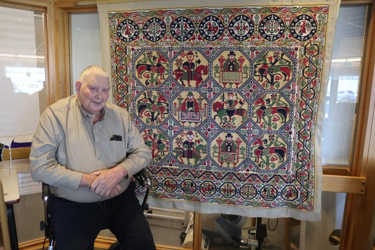 Blaðamaður Feykis fékk símtal frá Dagdvöl aldraðra á Sauðárkróki í vikunni og fékk að vita að stóra riddarateppið hans Kára Steindórssonar væri tilbúið. Ég hitti Kára síðast í Dagdvölinni í nóvember 2023 þegar hann hafði nýlokið við að sauma Litla Riddarateppið. Við Kári spjölluðum um lífið á sjónum og hvernig stóra netanálin breyttist í saumnál og hvernig gamli fléttusaumurinn hefur yfirtekið daga Kára þar sem hann vaknar alla daga og situr við og saumar út sem nemur eins og nokkurn veginn heilum vinnudegi.