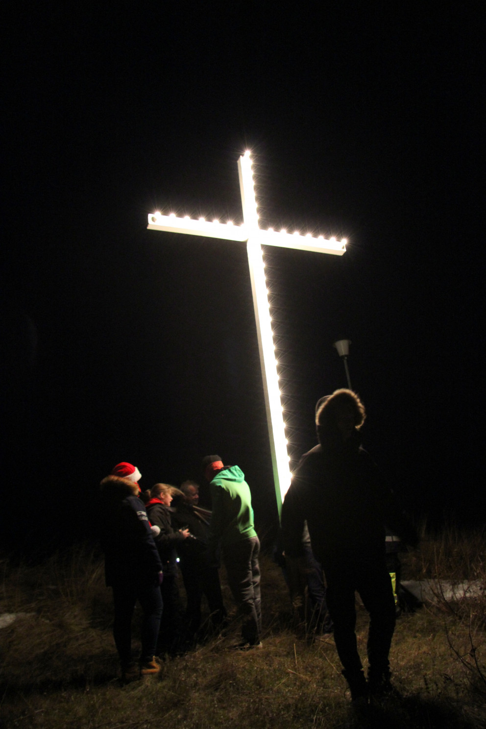 Hin árlega Friðarganga Árskóla fór fram í morgun en þá mynda nemendur skólans keðju á kirkjustígnum frá kirkju og upp á Nafir að ljósakrossinum. Ljósker er látið ganga milli nemendanna sem láta friðarkveðju fylgja með og þegar ljóskerið er komið að enda mannlegu keðjunnar er ljósið kveikt á krossinum við mikinn fögnuð viðstaddra. Formenn nemendafélags Árskóla hljóta þann heiður að kveikja á ljósakrossinum og í ár kom það í hlut Hildar Hebu Einarsdóttur og Arnars Freys Guðmundssonar.