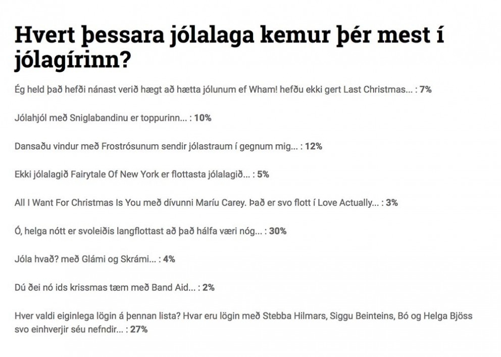 Raunar merktu 27% þátttakenda við möguleikann sem gaf ekki mikið fyrir alla kosti könnunarinnar og söknuðu þess að talin væru til lög með Bjögga Halldórs, Stebba Hilmars, Siggu Beinteins, Helga Björns og allra hinna. En þetta er eins og þegar Lars og Heimir velja landsliðið í fótbolta – það komast ekki allir í liðið!