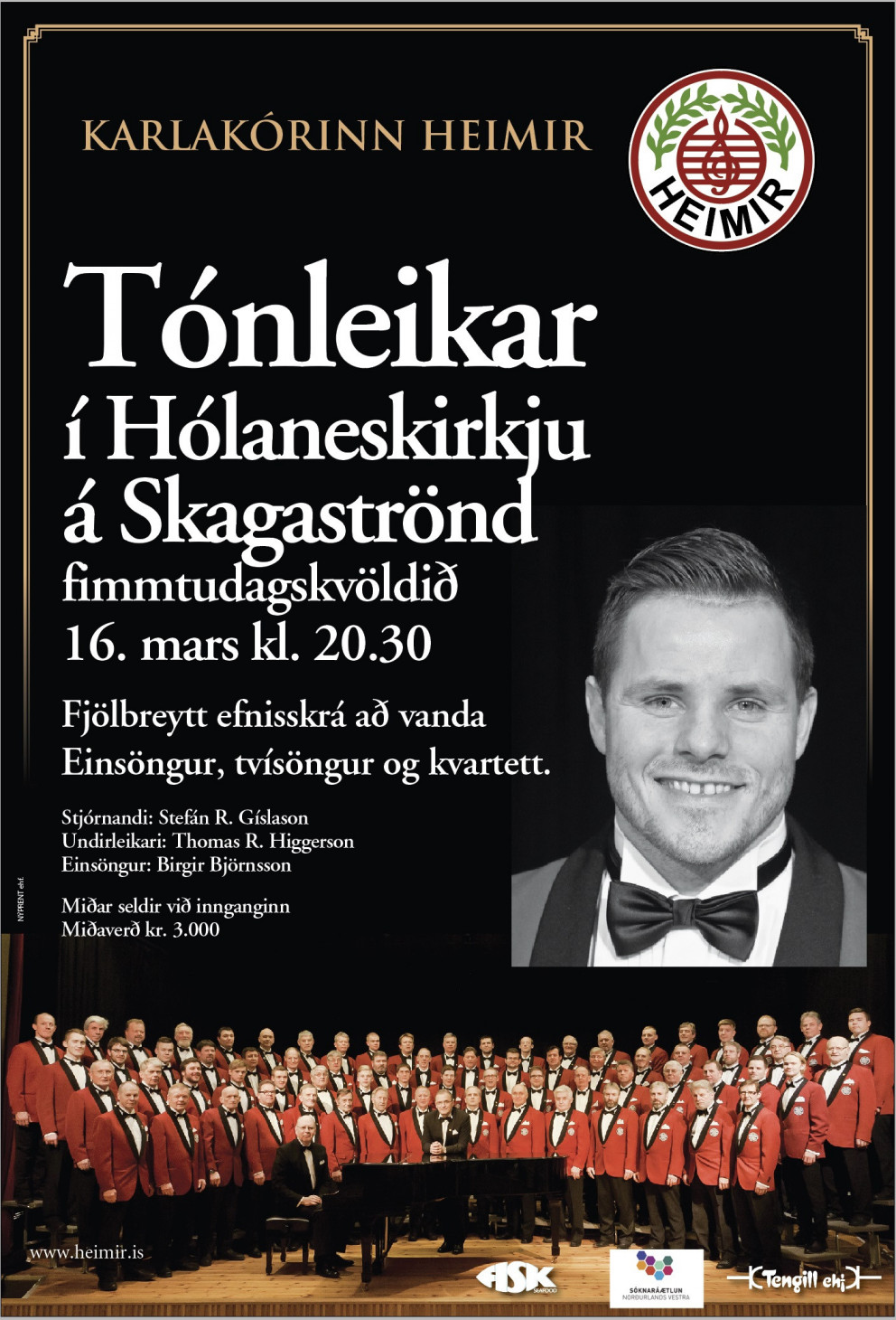 Karlakórinn Heimir í Skagafirði mætir í Hólaneskirkju á Skagaströnd í kvöld með fjölbreytta efnisskrá að vanda. Boðið verður upp á einsöng, tvísöng og kvartett auk hefðbundins kórsöngs. Einsöngvarar eru tveir, Birgir Björnsson og Óskar Pétursson.