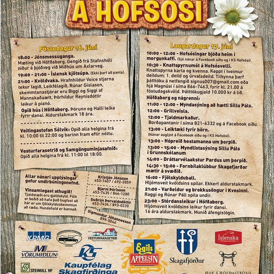 Jónsmessuhátíðin á Hofsósi hefst á morgun og eru íbúar nú á fullu að skreyta og gera sig klára til að taka á móti gestum. Fyrsti liðurinn á dagskrá hátíðarinnar er Jónsmessugangan sem ætíð hefur notið mikilla vinsælda. Gönguleiðin að þessu sinni er frá Kjaftamel í Stafshólslandi, um Axlarveg sem er gamall vegur og reiðleið, yfir í Tumabrekkuland og meðfram Miðhúsagerði uns komið er niður á Siglufjarðarveg rétt norðan við Miðhús í Óslandshlíð. Meðal þess sem fyrir augun ber er malarhóllinn Hastur þaðan sem er mjög fallegt útsýni. Segir sagan að þaðan hafi Grettir Ásmundsson borið stóra steininn, eða Grettistakið, sem stendur í Grafaránni, rétt við við Grafarós, og blasir við frá þjóðveginum. Sigrún Fossberg, fararstjóri í göngunni, segir að gangan sé létt, meira og minna niður í móti þar sem fólki gefist færi á að njóta fallegrar náttúru með miklu útsýni og fjölbreyttu fuglalífi. Jónsmessugangan hefst klukkan 18:00 og verður fólki ekið á upphafsreit með rútu.