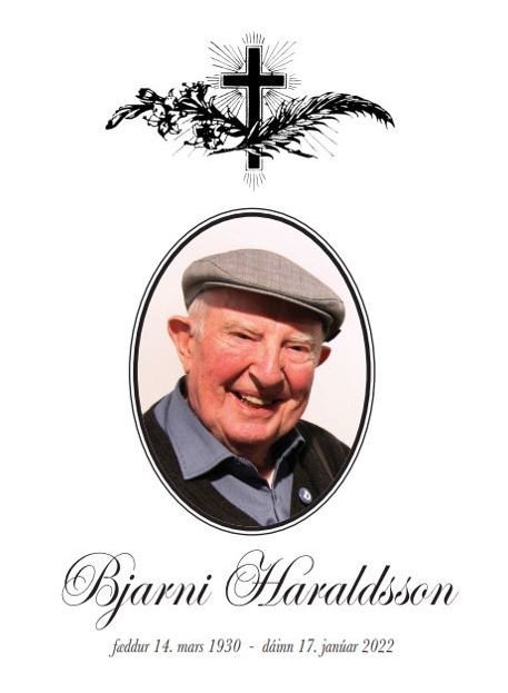 Nú er Bjarni afi farinn í Sumarlandið. Ég efast ekki um að þar hefur beðið hans glæsivagn, ábyggilega Chevrolet Malibu. Nú keyrir hann þar um greiða vegi, aðeins of hratt, með sixpensarann og glettnissvip í auga. Hann bíður þar enn og aftur eftir henni Dísu sinni sem nú lifir eiginmann sinn. Við sem eftir sitjum syrgjum góðan mann en minningin mun lifa með þeim sem hann elskaði mest eiginkonu, börnum, barnabörnum og langafastrákunum sex.