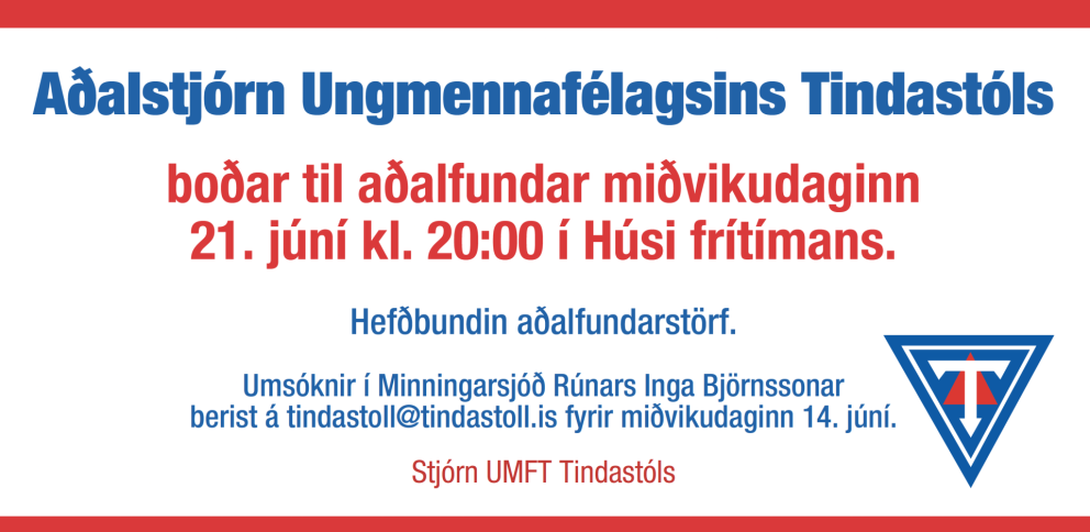 Aðalstjórn Ungmennafélagsins Tindastóls boðar til aðalfundar miðvikudaginn 21. júní kl. 20:00 í Húsi frítímans.