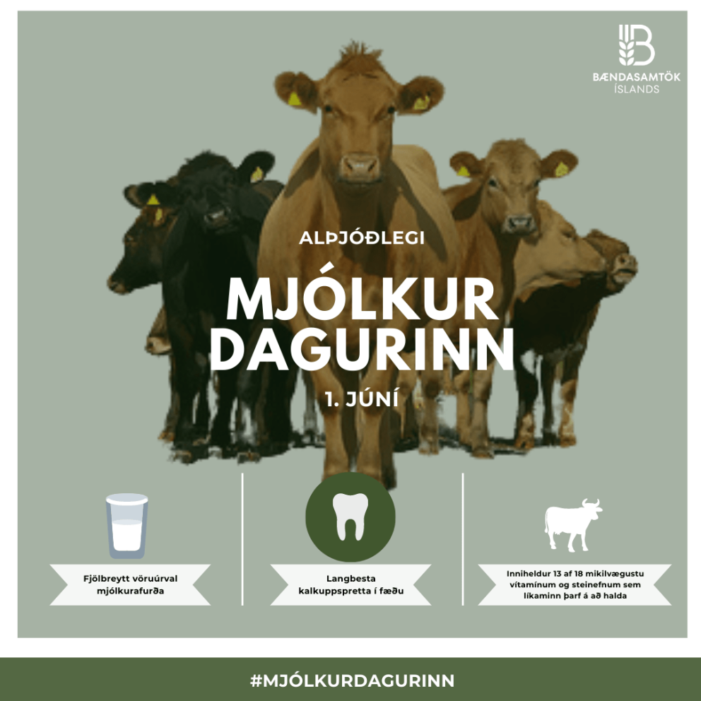 Alþjóðlegi mjólkurdaginn er 1. júní. Deginum er fagnað víða um heim og á Íslandi eru mjólkurframleiðendur hvattir til að birta myndir úr sveitum sínum á Instagram undir myllumerkinu #mjólkurdagurinn og merkja @baendasamtokin svo hægt sé að dreifa boðskapnum.