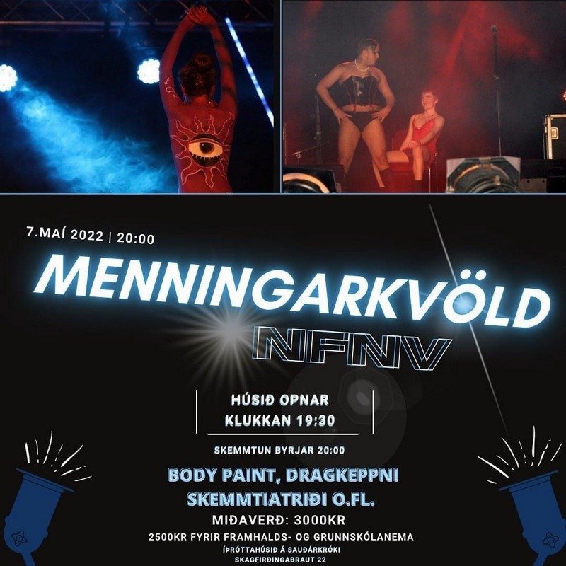 Menningarkvöld NFNV verður haldið þann 7. maí næstkomandi, í íþróttahúsinu á Sauðárkróki. Í boði verða tónlistaratriði, Bodypaint, dragkeppni og margt, margt fleira. „Brjálað stuð og geggjuð stemming!“ segir á Facebook-síðu nemendafélagsins.