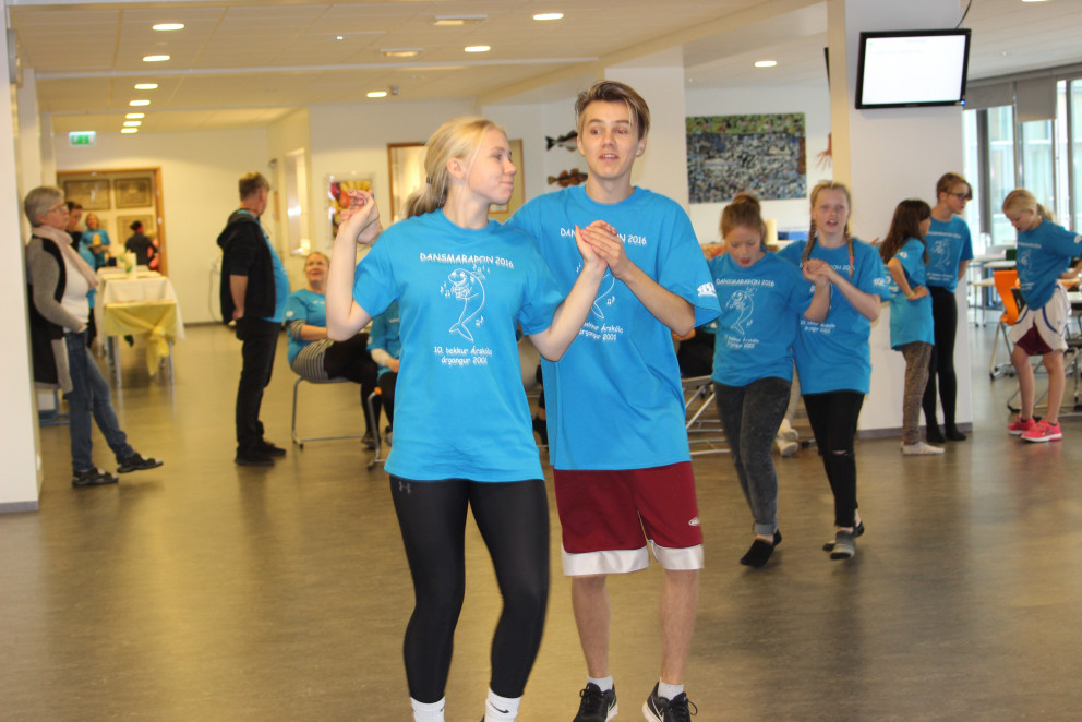 Hið árlega og sívinsæla dansmaraþon 10. bekkinga Árskóla á Sauðárkróki hófst kl. 11 í morgun og er nú komið að árgangi 2001 að teygja skankana í sólarhring. Danssýning allra nemenda klukkan 17:00 í íþróttahúsinu.