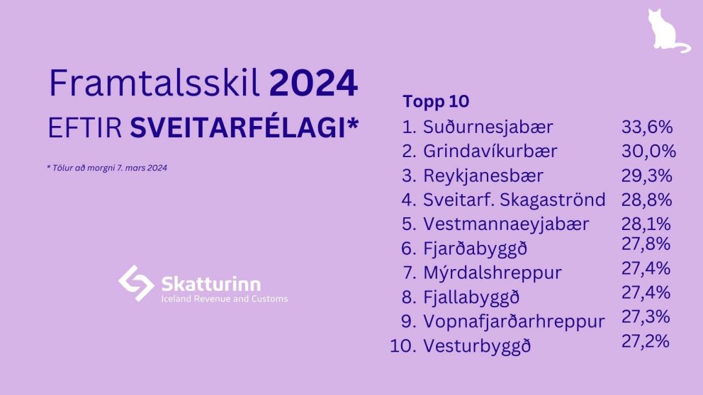 Framtalsskilin eru í blússandi gangi og framtalsgleði mikil víðsvegar um landið segir á Facebook-síðunni Skatturinn og eru nú 21% landsmanna búin að skila framtali. Áhugavert er að rýna í tölurnar og skoða út frá sveitarfélögum hver eru duglegust að skila. Þar sést að Reykjanesið er leiðandi í framtalsskilunum með gull, silfur og brons, langt yfir landsmeðaltali og Sveitarfélagið Skagaströnd er í fjórða sæti. Eigum við ekki að koma öllum sveitarfélögunum hér á Norðurlandi vestra í topp 10 listann? Skilafrestur er til 14. mars.