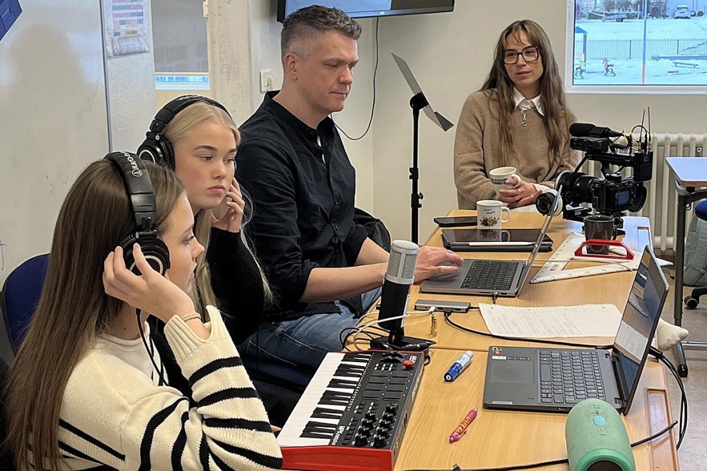 Feykir sagði frá því í síðustu viku að skólarnir á Hvammstanga og Hofsósi hefðu komist í úrslit í Málæði, verkefni sem List fyrir alla stendur að í félagi við Bubba Morthens með það að markmiði að fá skólabörn til að semja lög og texta á íslensku. Krakkarnir á unglingastii Grunnskólans austan Vatna fékk góða gesti í heimsókn í skólann á þriðjudaginn vegna þessa.