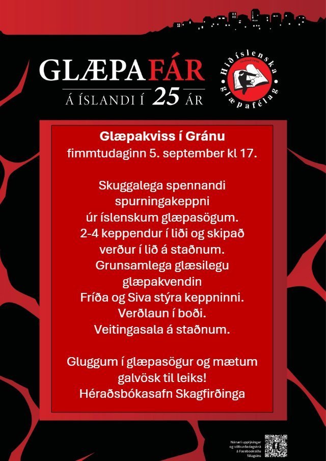 Héraðsbókasafn Skagfirðinga, í samvinnu við Hið íslenska glæpafélag, stendur fyrir Glæpakvissi í Gránu fimmtudaginn 5. september kl. 17:00. Gert er ráð fyrir 2-4 keppendum í liði og skipað verður í lið á staðnum, svo það er ekki skilyrði að vera búinn að finna sér liðsfélaga áður en mætt er á staðinn. Spurningarnar eru úr íslenskum glæpasögum. Hin grunsamlega glæsilegu glæpakvendi, Fríða og Siva, munu stýra keppninni. Gert er ráð fyrir að viðburðurinn taka um einn og hálfan tíma.